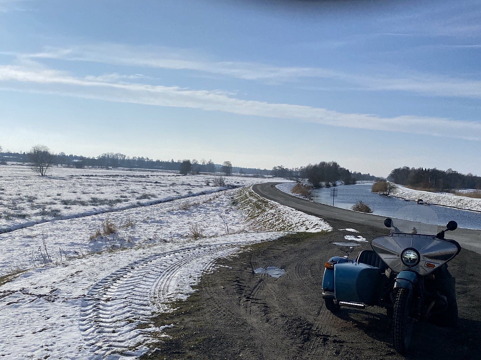 Gut, das war keine so tolle Idee. Am Ende des Weges stand ich vorm Deich auf einer überschwemmten Wiese. So tief, daß mir beim Umdrehen die Stiefel voll liefen. Ich hatte ganz schön zu tun, um aus dem Polder heraus zu kommen. Zeitweise dachte ich, ich müsse die Maschine aufgeben.